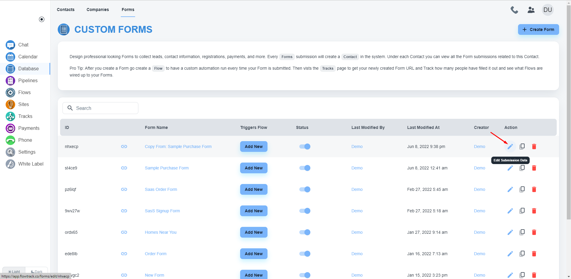 通过单击左侧菜单上的“数据库”导航到表单构建器。 然后,当您打开数据库页面时,您会在页面顶部看到“表单”的链接,请单击该链接。