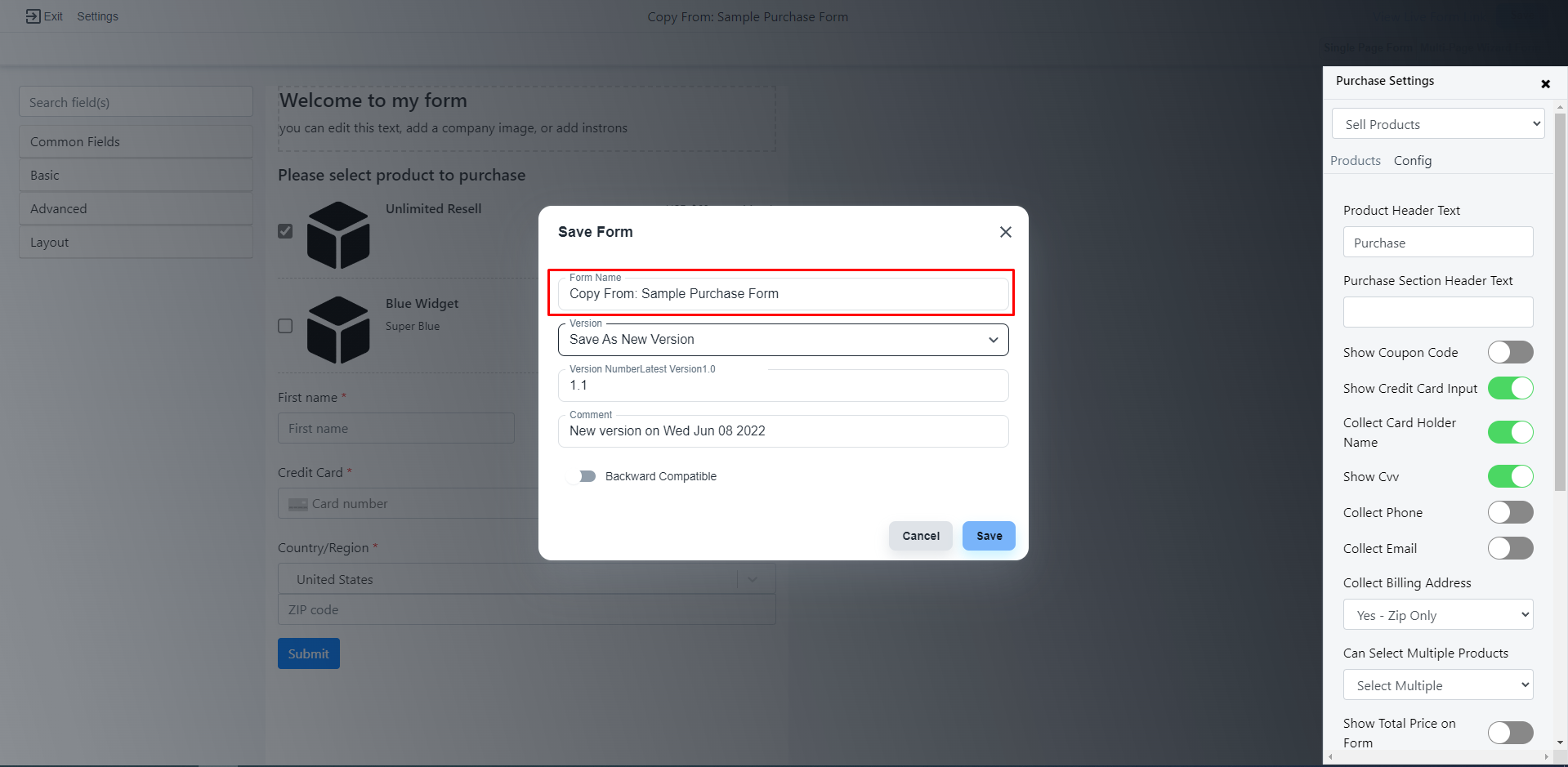 点击保存按钮后,系统会弹出一个框。 您可以在此处更改表单的初始名称、最终名称。
