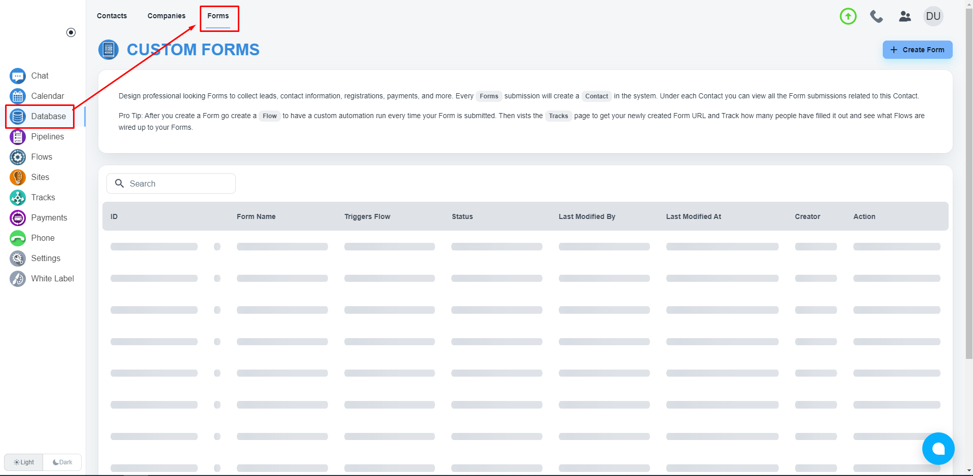 加载表单生成器 通过单击左侧菜单上的“数据库”导航到表单构建器。 然后,当您打开数据库页面时,您会在页面顶部看到“表单”的链接,请单击该链接。 (见下图)