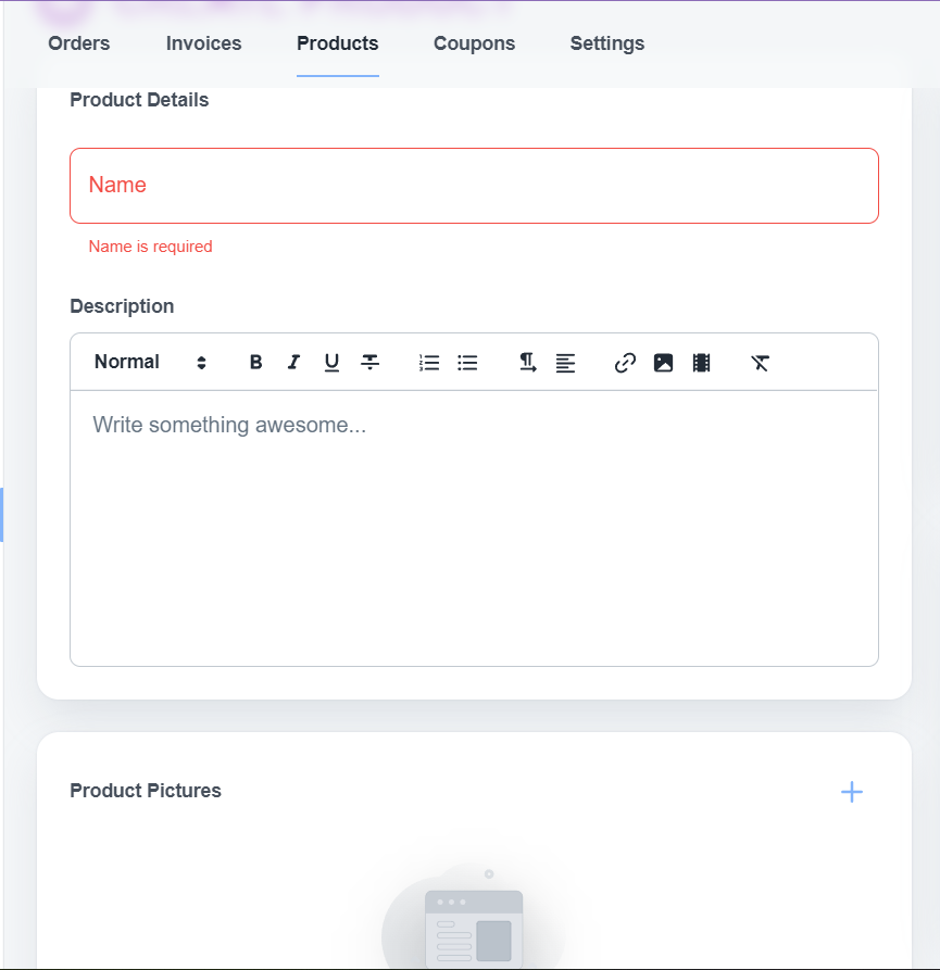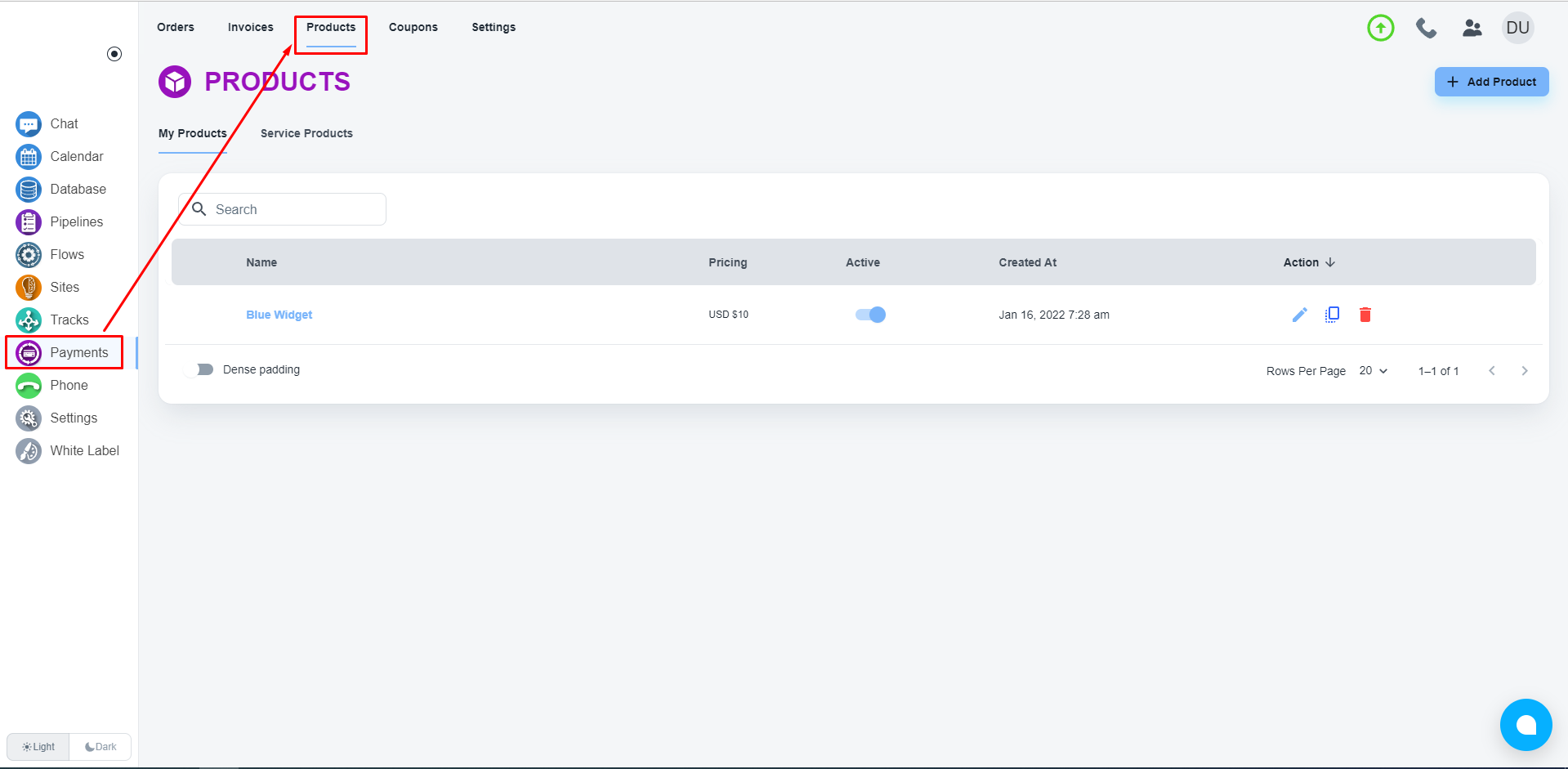 通过单击左侧菜单上的“付款”导航到产品构建器。 然后,当您打开数据库页面时,您会在页面顶部看到一个指向“产品”的链接,请单击该链接。
