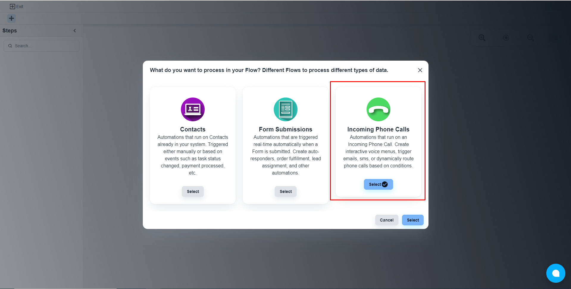系统将弹出一个消息框,选择第三个选项“来电呼叫”。 单击“选择”按钮。