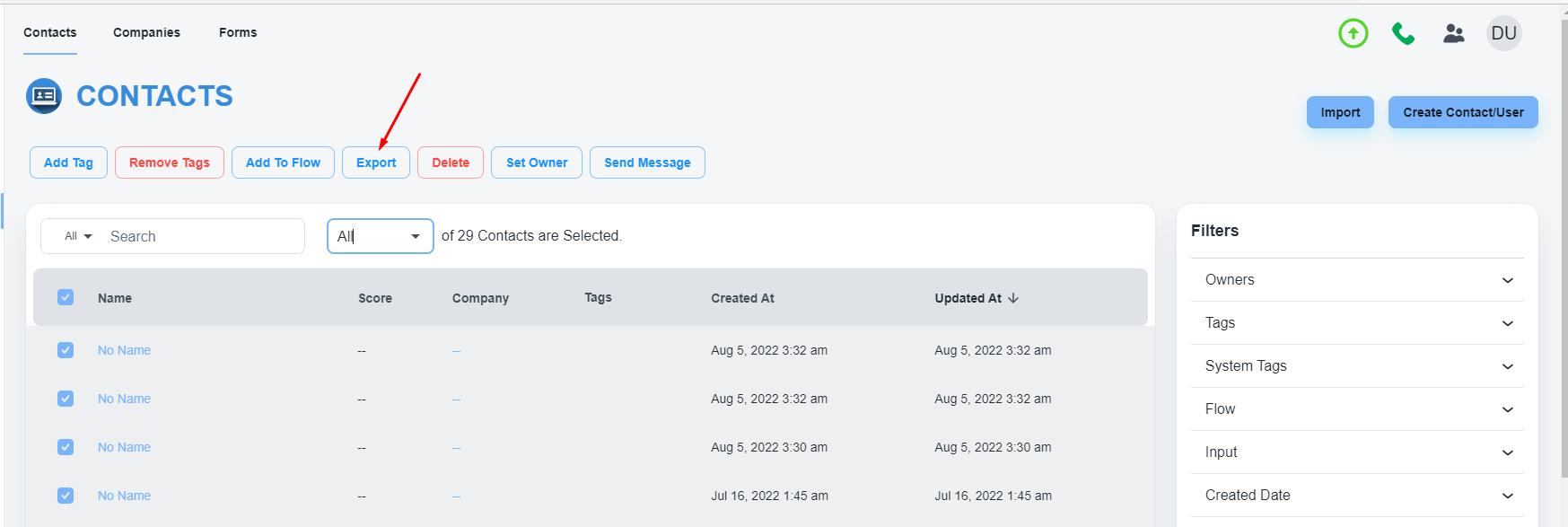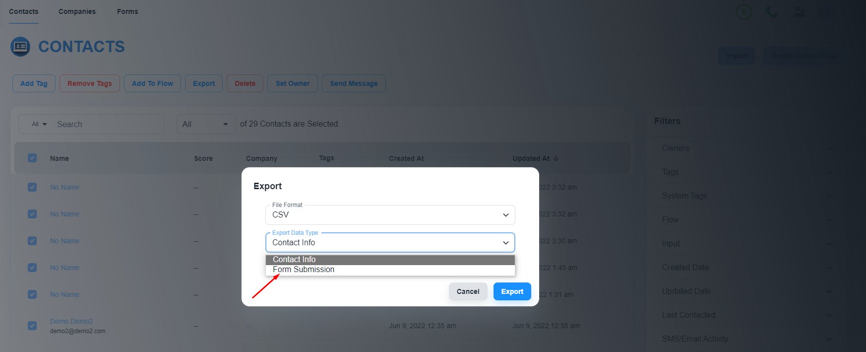 如何导出用户提交的表单数据?2022年09月24日导出提交的表单数据的步骤请导航到左侧菜单栏上的“仪表板”选择所有联系人并单击“导出”按钮在这里您可以选择“表单提交”选项您现在可以以 CSV 格式导出数据了