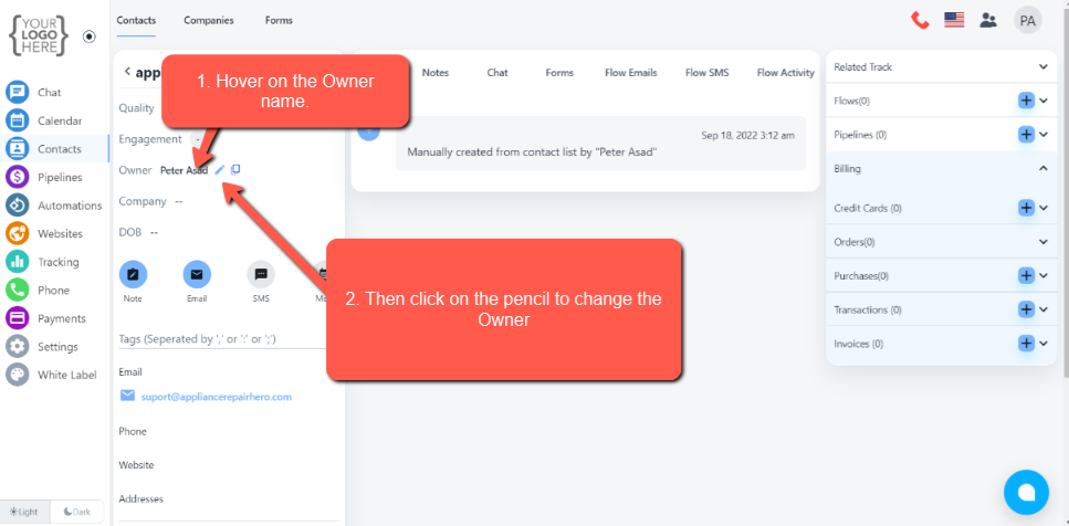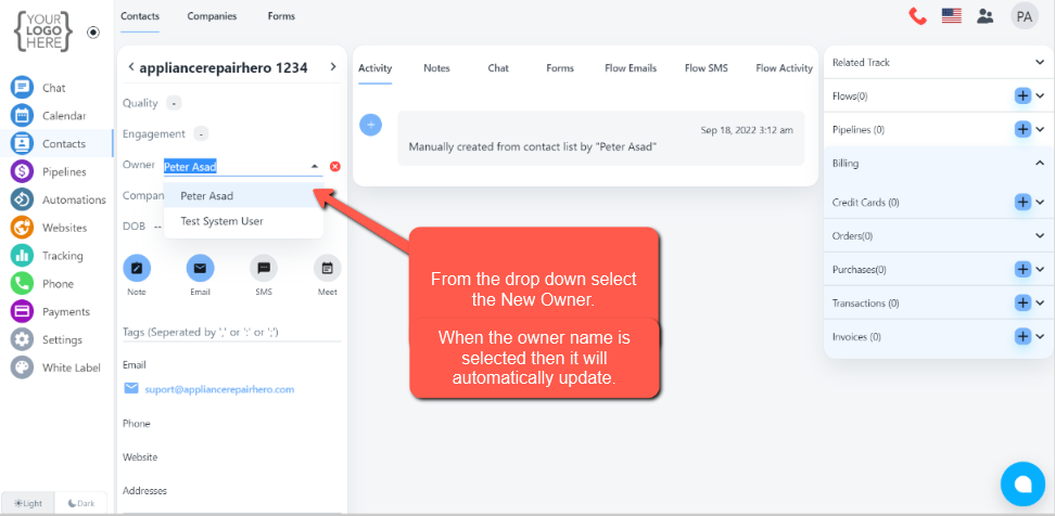 3. 然后将鼠标悬停在所有者名称上,它会显示铅笔图标,单击它会显示包含所有者的下拉列表。 从中您可以选择所需的一个。