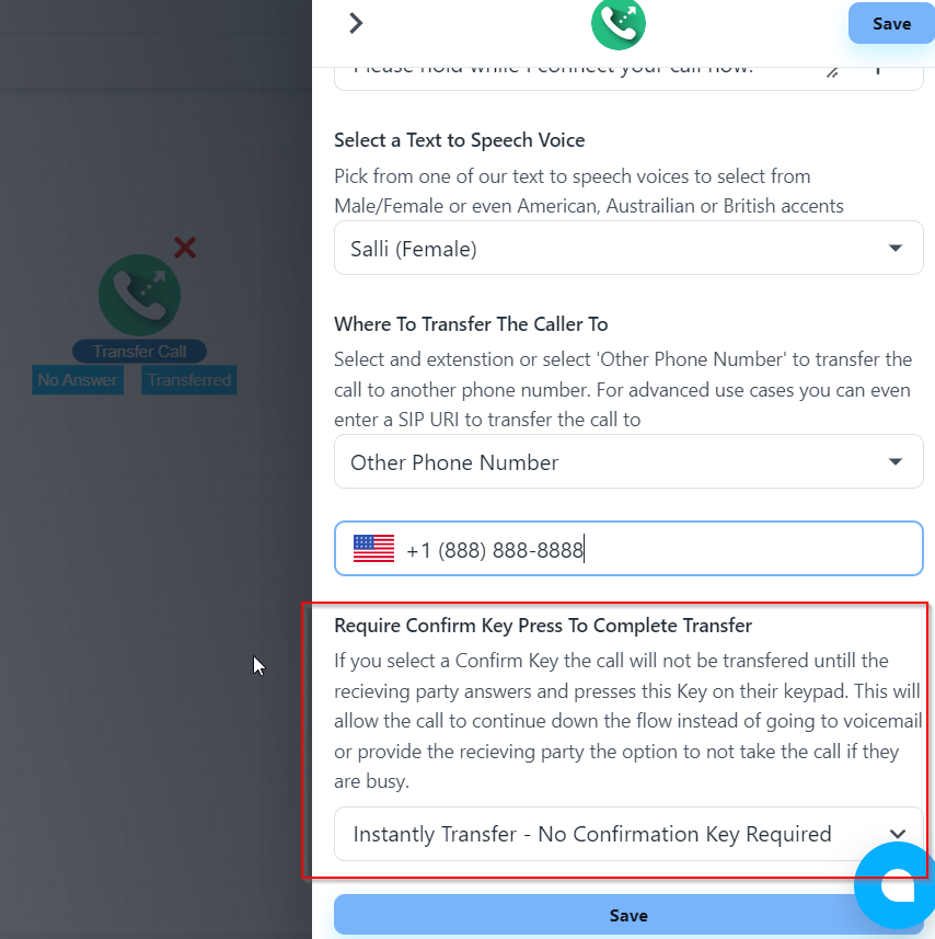 1. 选择电话转接步骤 2. 在转接呼叫步骤下,您会找到许多设置转接的选项。 3. 转到“需要确认按键才能完成传输”步骤来设置您的耳语 如果您选择确认键,则在接收方应答并按下其键盘上的此键之前,呼叫不会被转移。这将使得呼叫继续进行而不是转到语音信箱,或者可以为接收方提供在繁忙时不接听电话的选项