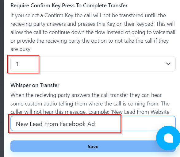 在上图中,您可以看到我选择了按 1键 来完成传输,并在传输过程中设置耳语为“来自 Facebook 广告的新潜在客户”。