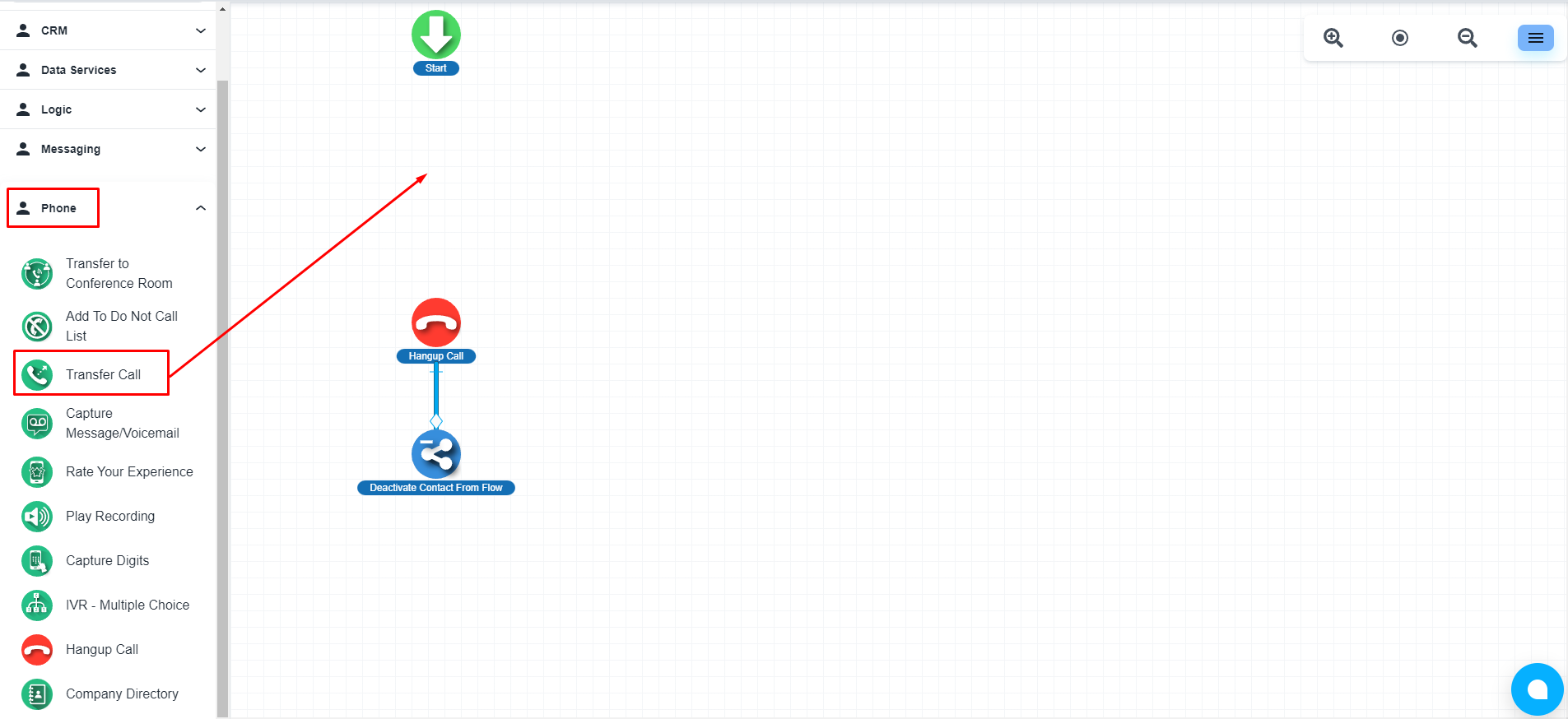 在流程构建器中,您将在“电话”部分下看到“转接呼叫”步骤,拖动此步骤到流程中。
