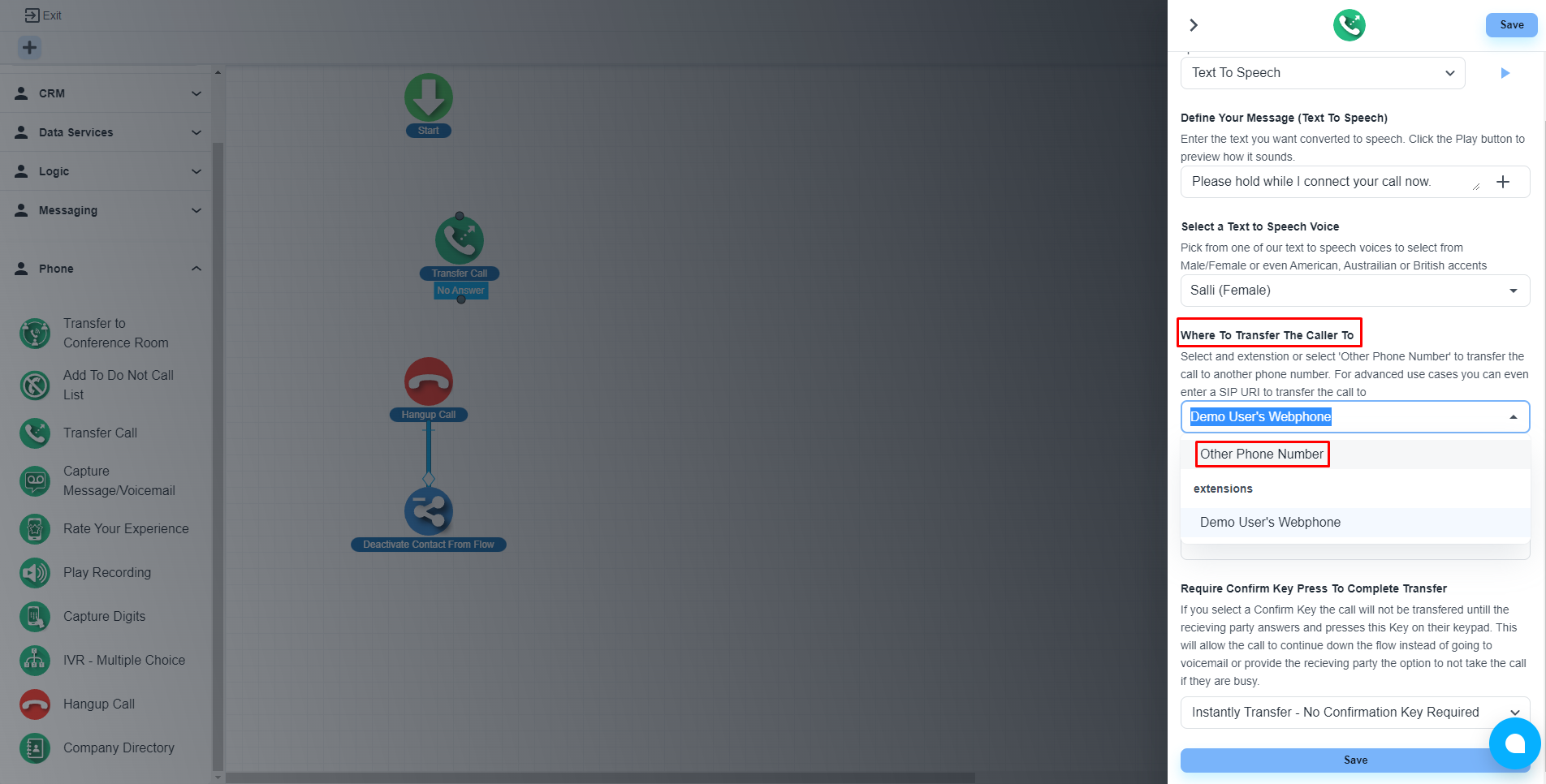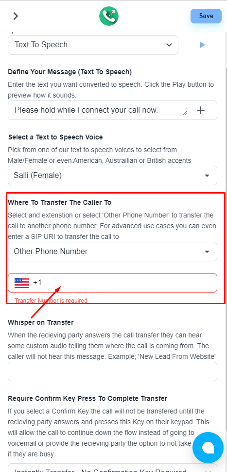 在此步骤的配置部分,从“将呼叫者转移到”下拉列表中选择“其他电话号码”选项。