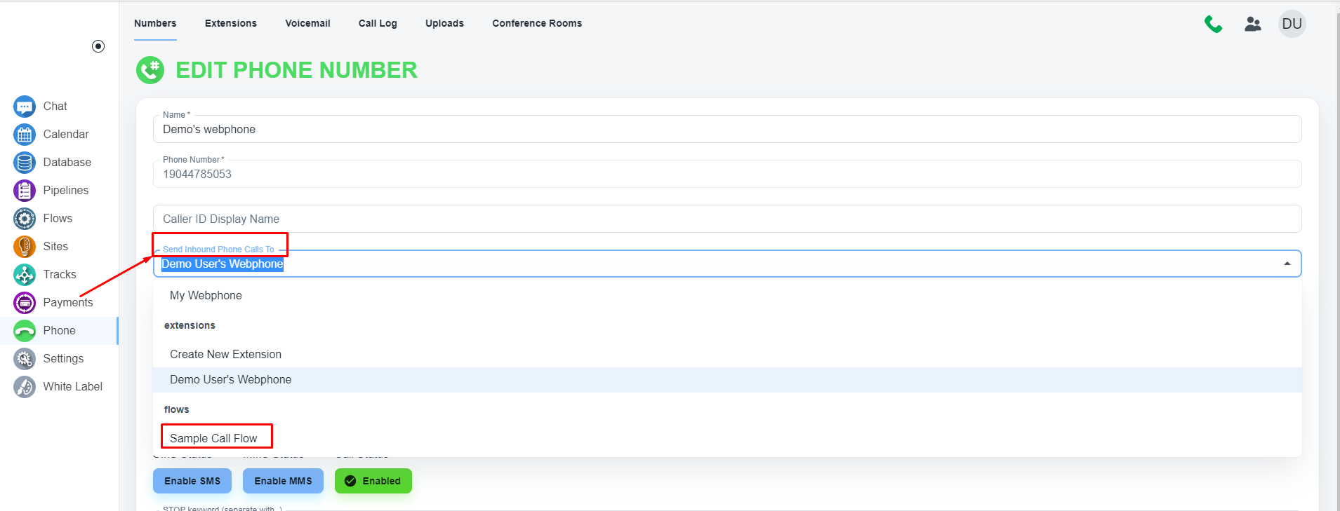 请选择“将呼入电话发送至”下拉菜单,系统将为您提供包含现有呼叫流程的列表。 请选择需要的流程。
