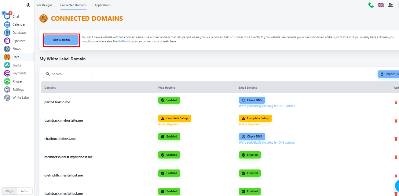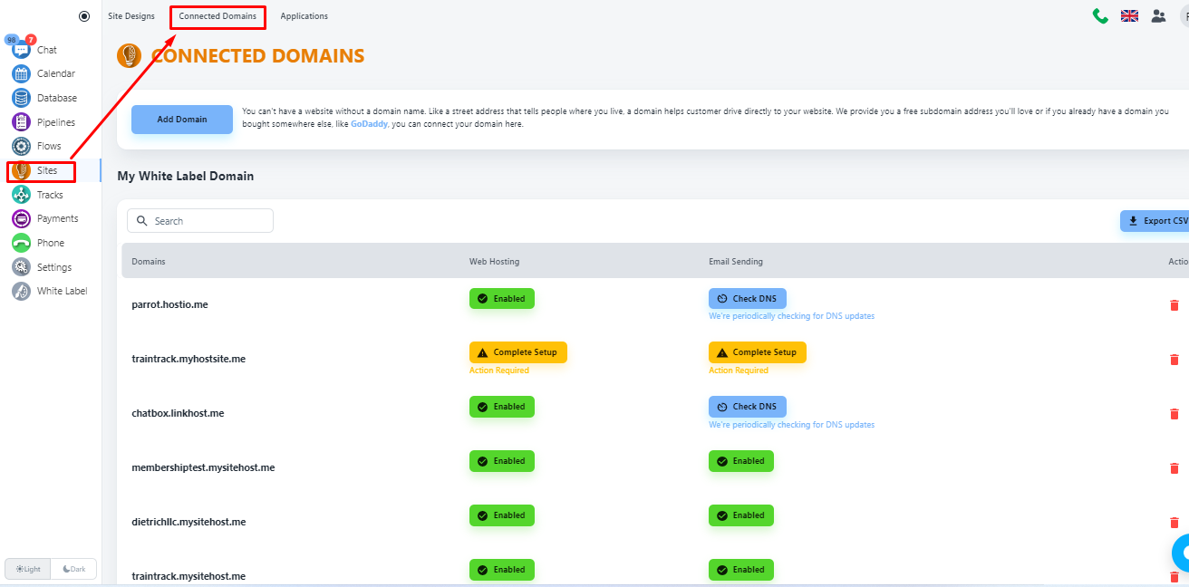 通过单击左侧菜单上的“站点”导航到域面板。 然后,当您打开该页面时,您会在页面顶部看到一个指向“已连接域”的链接,请单击该链接。