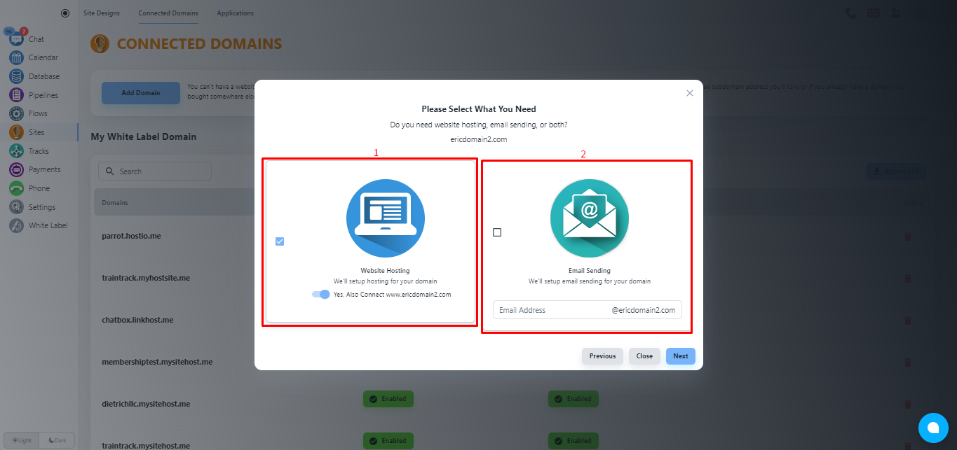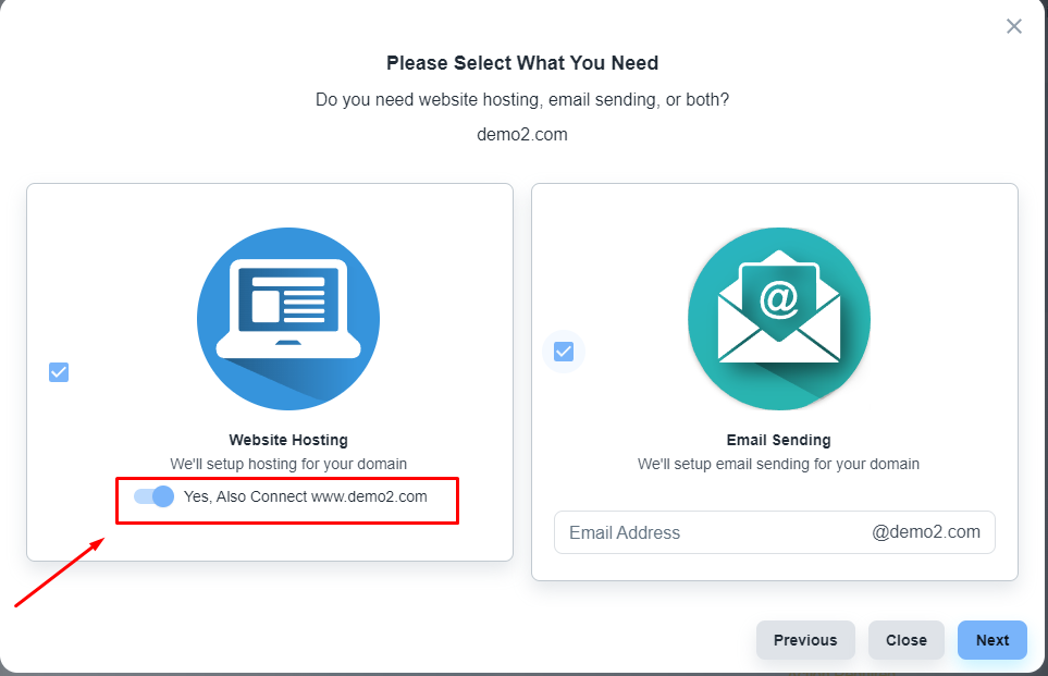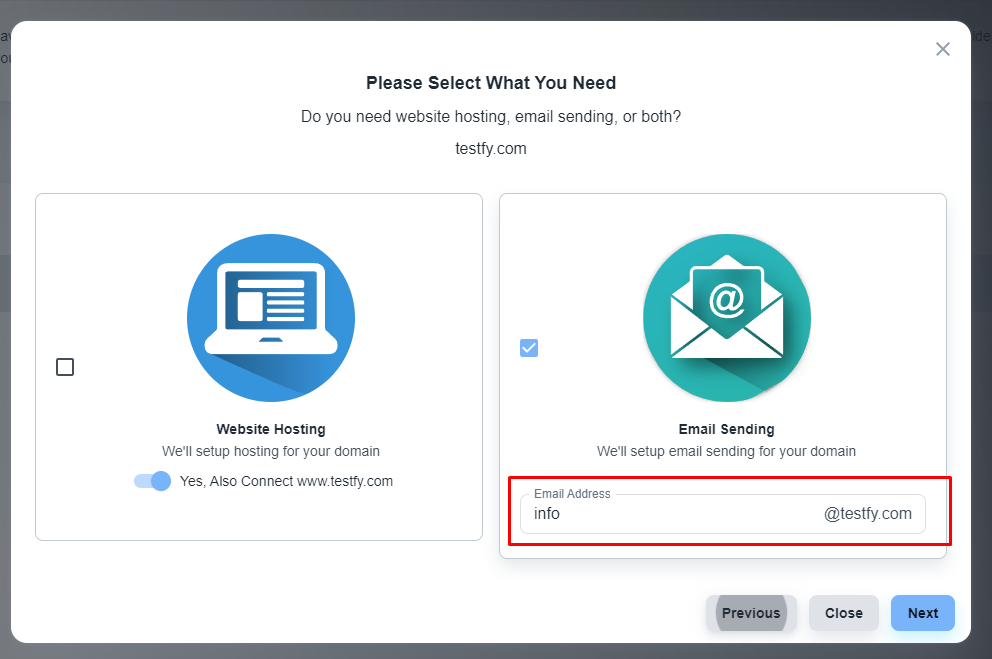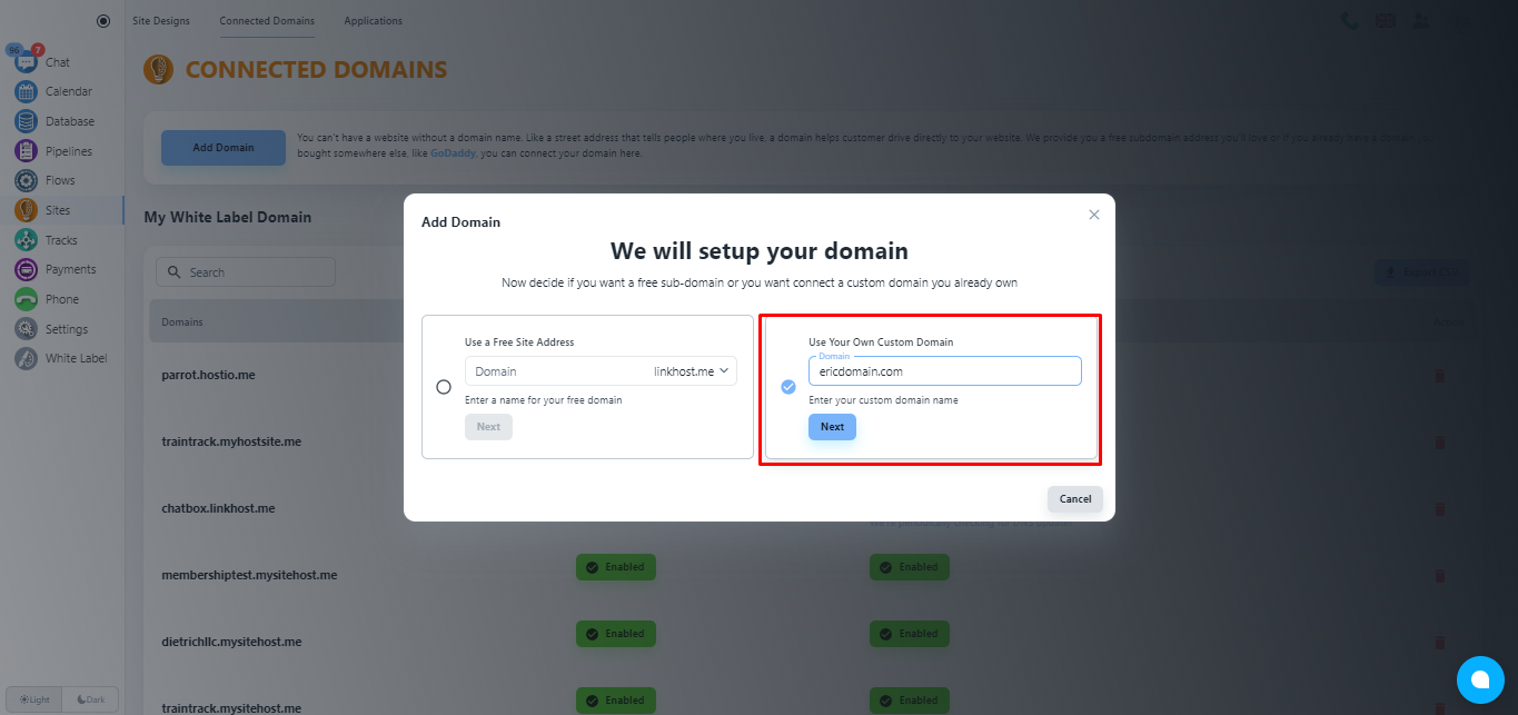 系统将允许您添加免费域或自定义域。 此处,我们将选择第二个选项,并输入您的域名。