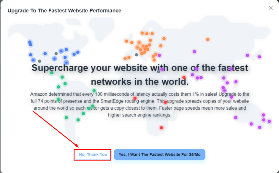 现在,系统将为您提供选择更快的 CDN 的选项(收费),以便为您的用户提供更好的 Web 服务体验。若不需要,请点击“不,谢谢”按钮。