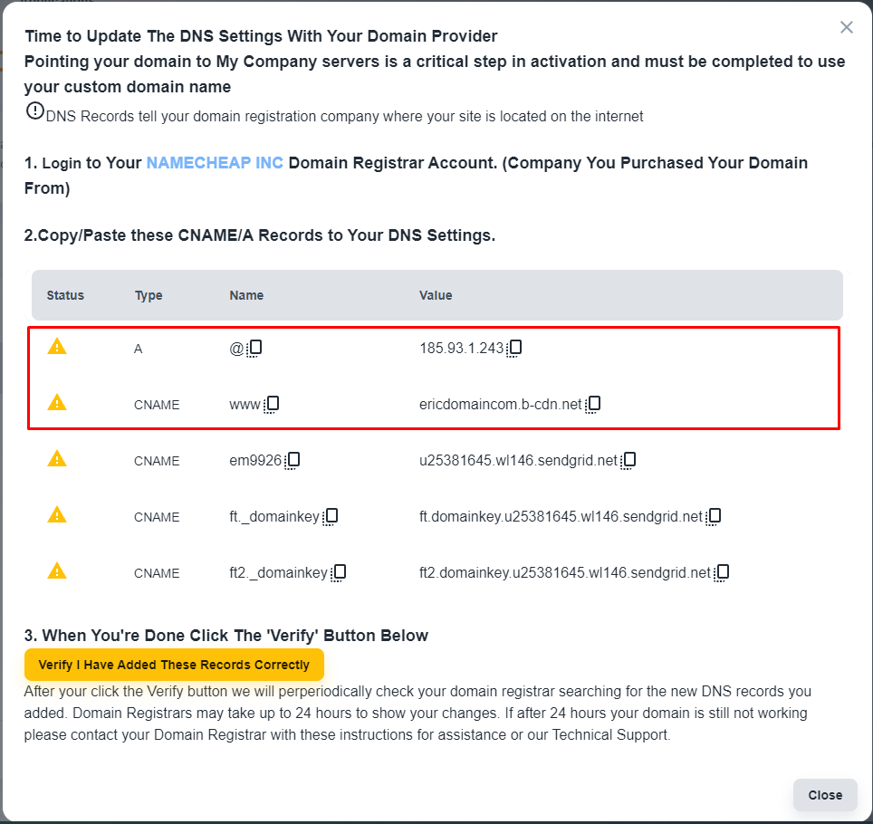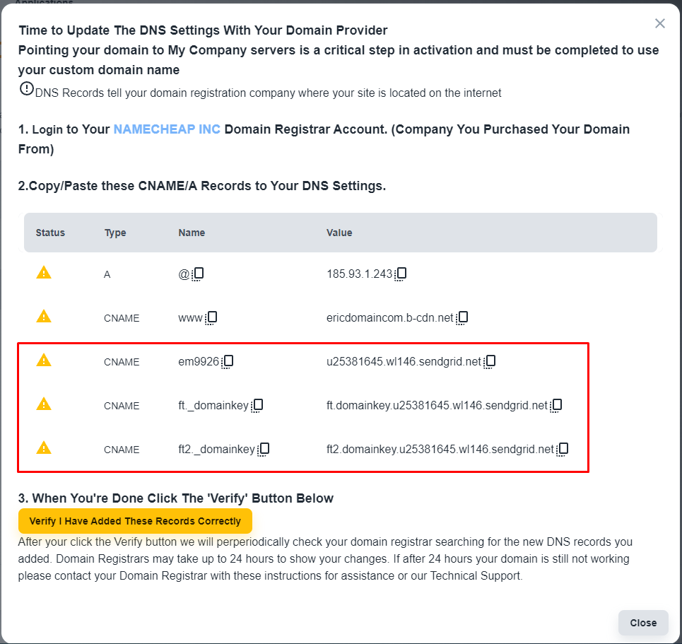 稍等之后, 系统将为您提供可以添加到您的域注册商的所需 DNS 记录。