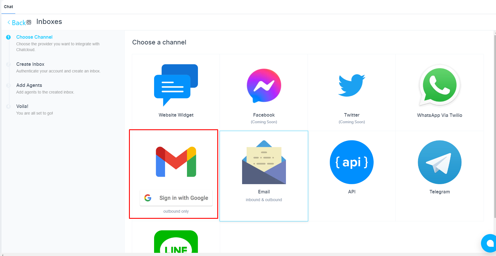 请导航到左侧菜单栏上的“聊天”。 打开页面并单击顶部菜单栏上的“收件箱”。 最后,单击“添加收件箱”按钮。