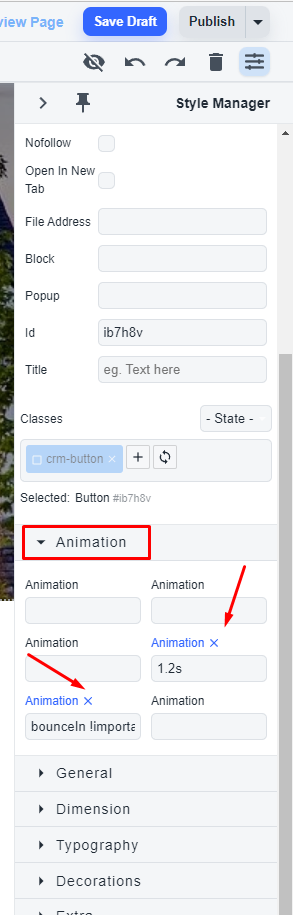 如何删除应用于元素的动画?2022年09月25日从元素中移除动画的步骤选择元素请选择您应用了动画的元素打开样式管理器选择元素后,请点击网页构建器右上角的样式管理器图标移除动画在样式名称上,您将看到一个带有动画设置的部分。 请删除所有设置提示:您可能有更多设置,请删除所有设置