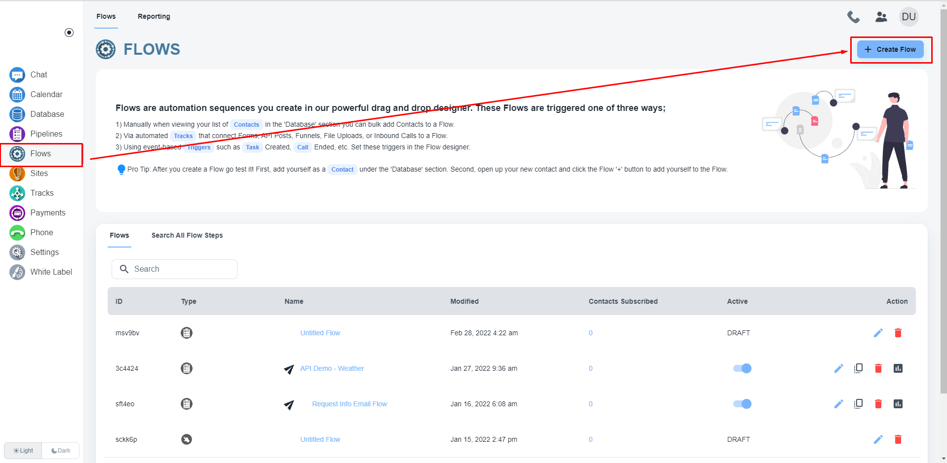 加载流生成器 通过单击左侧菜单上的“流程”导航到流程构建器。 然后,当您打开流程页面时,您会在页面顶部看到“流程”的链接,请单击该链接。 单击“创建流程”按钮。