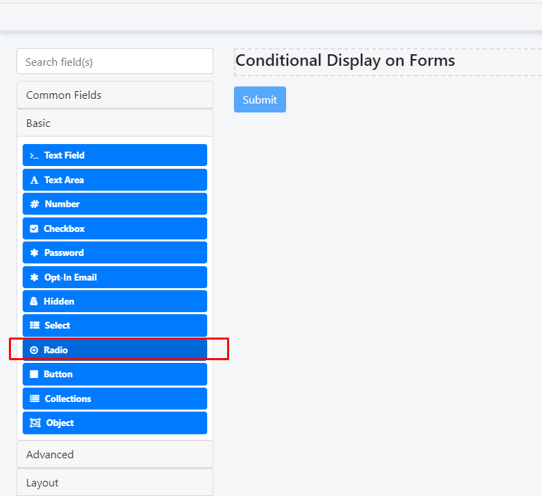 在基本部分下,我们有radio单选字段。 请拖动该字段