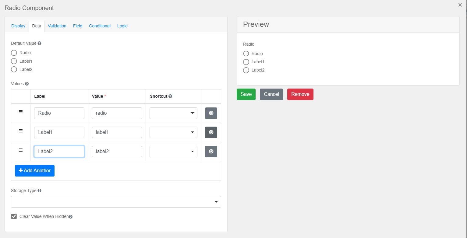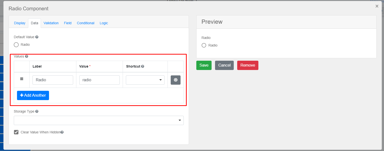 在该数据选项卡下,您可以选择为单选字段添加值和标签