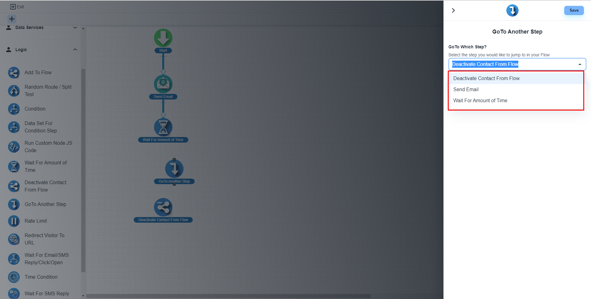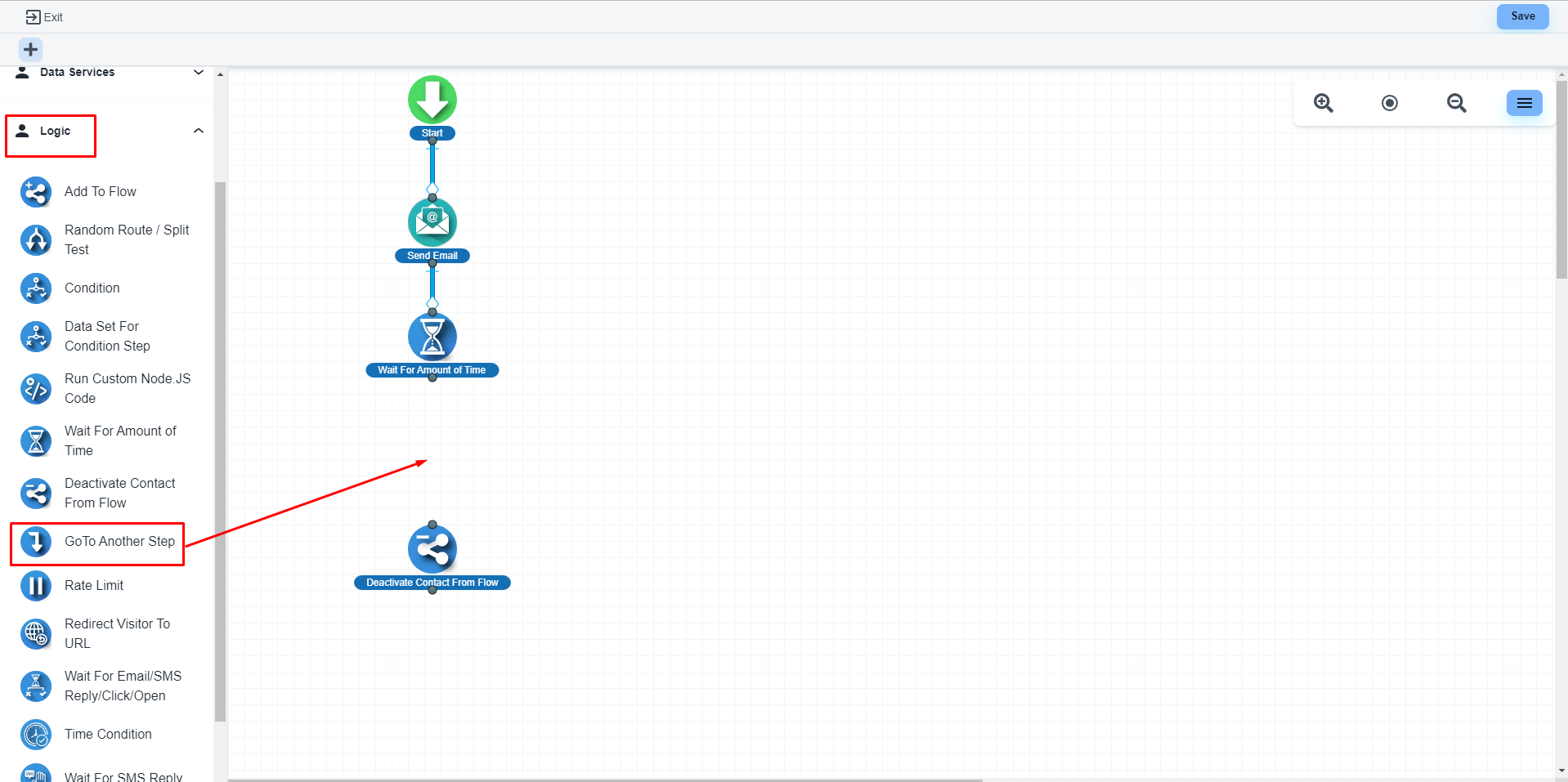 在“逻辑”部分下,我们还有另一个步骤“转到另一个步骤”。 请将此步骤添加到您的流程中