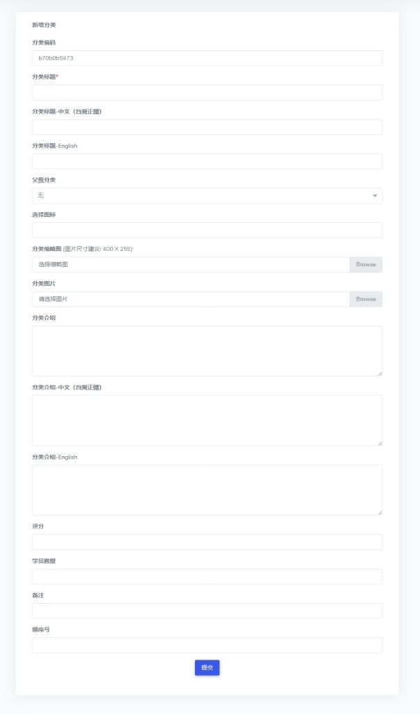 新增分类2022年06月27日 新增分类分类编码:系统默认不需要更改分类标题:建议不要4个汉字不要太多文字,移动端显示不美观多语言标题仅在该语种下显示选择图标:在默认图标里选择分类缩略图:建议尺寸400*255或者 150*150图标(优先移动端)分类图片:在分类页面顶部显示(移动端)尺寸为16:9分类介绍:顺序号:分类排序(优先级1、2、3、4...)