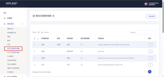 系统开通了英文口语测评功能后,将在课程管理下看到菜单:英文口语测评设置。