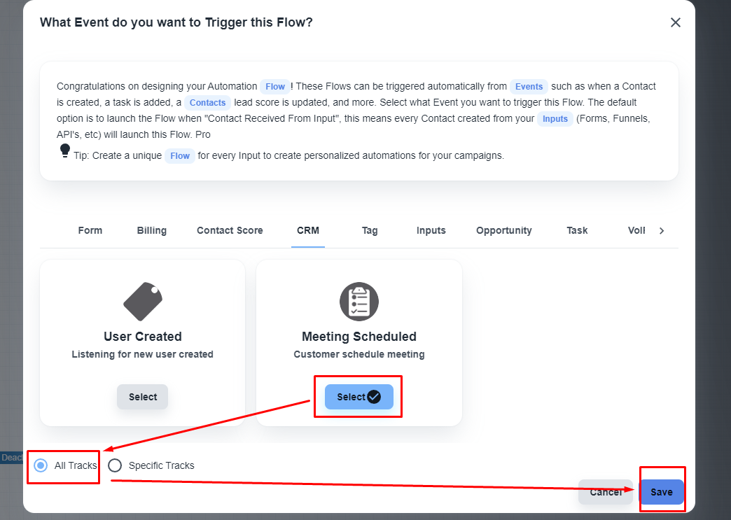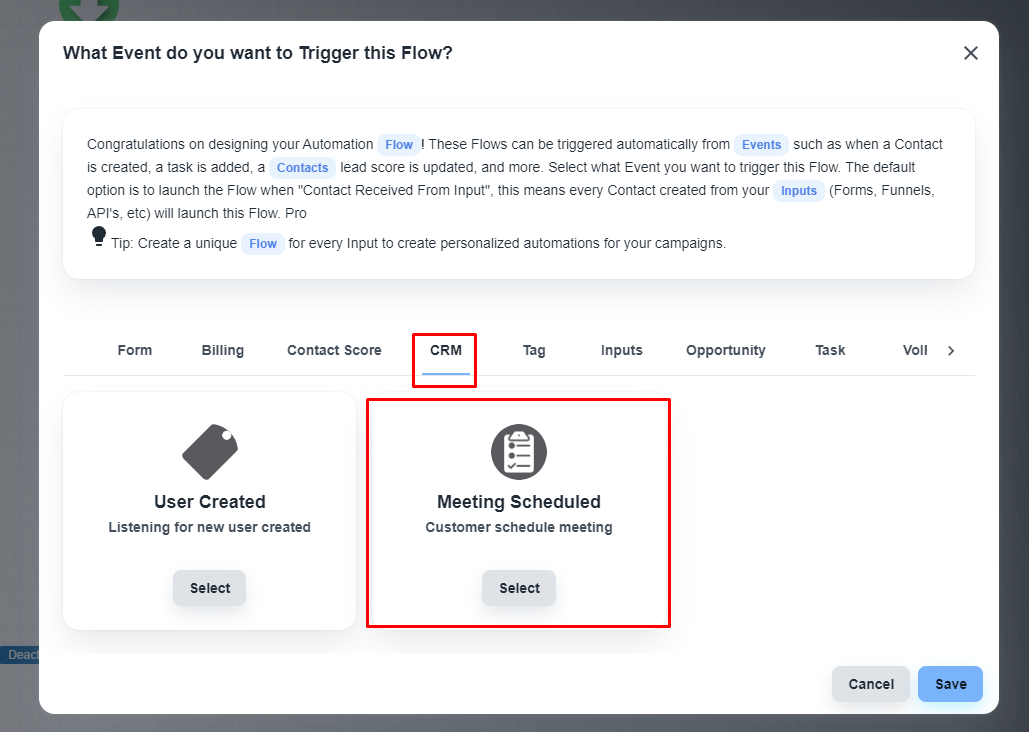 系统将向您显示系统内所有可用的触发器。 在“CRM”选项卡下,您将获得“已排期的会议”触发器。
